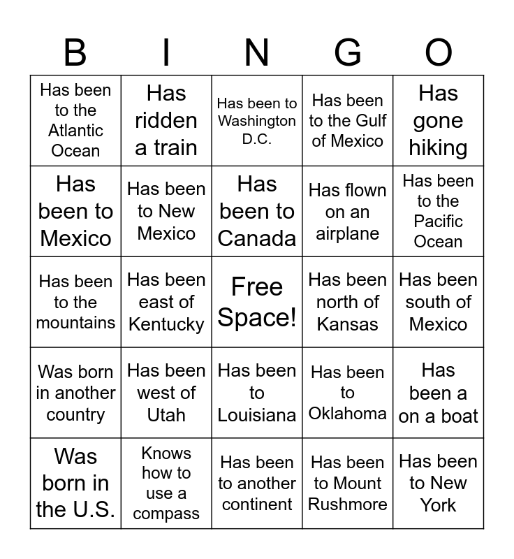 This bingo card has a free space and 24 words: Has been west of Utah, Knows how to use a compass, Has been to Canada, Was born in the U.S., Has gone hiking, Has been to the Atlantic Ocean, Has been to Mexico, Has ridden a train, Has been north of Kansas, Has been to Louisiana, Has flown on an airplane, Has been to the mountains, Has been to Oklahoma, Has been a on a boat, Has been to New Mexico, Has been to Mount Rushmore, Has been south of Mexico, Has been to Washington D.C., Has been to the Pacific Ocean, Has been east of Kentucky, Has been to New York, Was born in another country, Has been to the Gulf of Mexico and Has been to another continent.