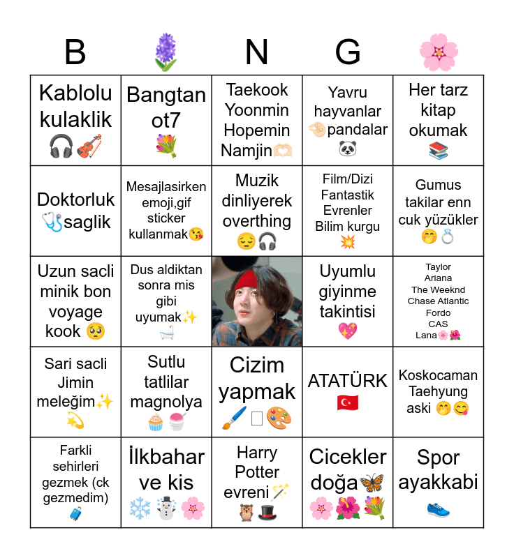 This bingo card has a free space and 24 words: Sutlu tatlilar magnolya 🧁🍧, İlkbahar ve kis ❄️☃️🌸, Muzik dinliyerek overthing 😔🎧, Farkli sehirleri gezmek (ck gezmedim)🧳, Her tarz kitap okumak📚, Kablolu kulaklik 🎧🎻, Doktorluk 🩺saglik, Bangtan ot7 💐, Uyumlu giyinme takintisi 💖, Cizim yapmak 🖌️🎨, Film/Dizi Fantastik Evrenler Bilim kurgu 💥, Uzun sacli minik bon voyage kook 🥺, ATATÜRK 🇹🇷, Koskocaman Taehyung aski 🤭😋, Mesajlasirken emoji,gif sticker kullanmak😘, Cicekler doğa🦋🌸🌺💐, Taylor Ariana The Weeknd Chase Atlantic Fordo CAS Lana🌸🌺, Taekook Yoonmin Hopemin Namjin🫶🏻, Gumus takilar enn cuk yüzükler🤭💍, Dus aldiktan sonra mis gibi uyumak✨🛁, Spor ayakkabi 👟, Sari sacli Jimin meleğim✨💫, Yavru hayvanlar🤏🏻pandalar🐼 and Harry Potter evreni🪄🦉🎩.