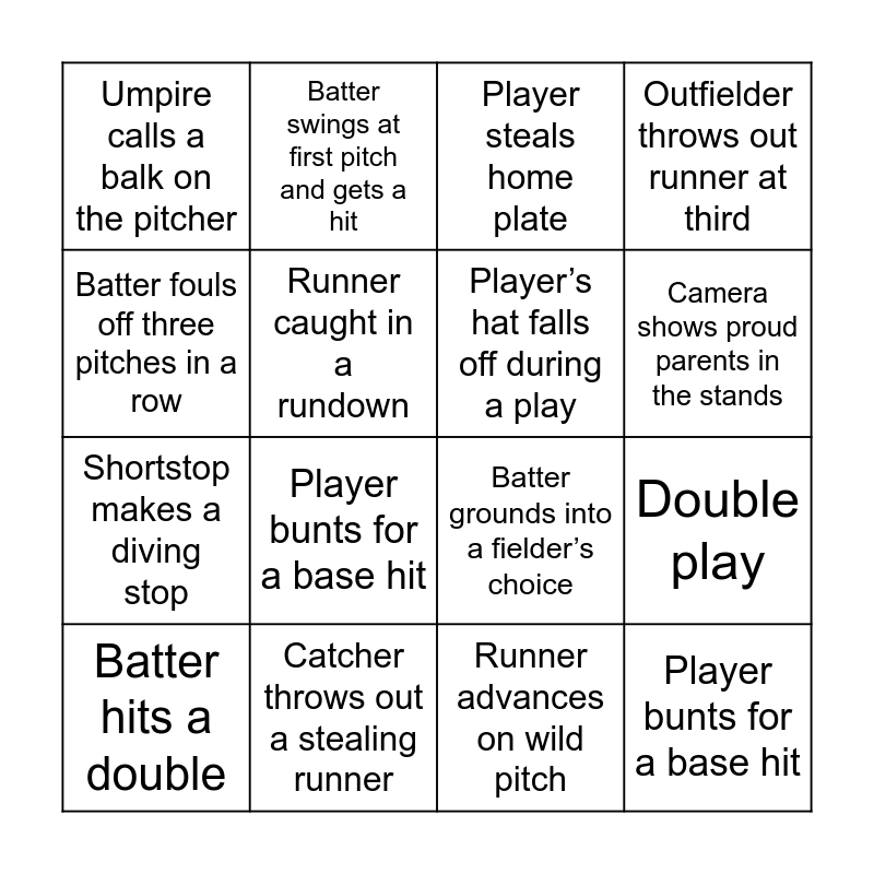 This bingo card has 54 words: Free!, Player bunts for a base hit, Runner advances on a passed ball, Coach visits the mound to talk to the pitcher, Batter fouls off three pitches in a row, Batter swings and misses on a full count, Outfielder throws out runner at third, Pitcher throws a wild pitch, Runner caught in a rundown, Batter strikes out looking, Umpire calls a balk on the pitcher, Pitcher checks the runner multiple times, Player claps for themselves after a hit, Passed ball by catcher, Outfielder loses the ball in the sun, Runner steals a base, Batter hits a double, Shortstop makes a diving stop, Umpire consults with another umpire on a close call, Runner advances on wild pitch, Player’s shoelace comes untied during play, Batter strikes out swinging, Catcher throws out a stealing runner, Batter fouls off three pitches in a row, Pitcher throws three consecutive strikes for a strikeout, Batter swings at first pitch and gets a hit, Player adjusts batting gloves multiple times, Line drive to left field, Home run, Batter draws a walk, Batter gets hit by a pitch, Pitching change, Player argues a call with the umpire, Player makes a diving catch in the outfield, Player steals home plate, Catcher blocks a ball in the dirt, Batter grounds into a fielder’s choice, Coach calls a timeout, Umpire makes a close call at the plate, Player’s hat falls off during a play, Player loses their helmet while running, First baseman stretches for an out, Pop fly caught in right field, Runner tags up and scores on a fly ball, Pitcher throws a pickoff move to second base, Umpire calls a fair ball down the line, Batter swings at first pitch and gets a hit, Pitcher strikes out side, Camera shows proud parents in the stands, Double play, Player bunts for a base hit, Runner scores from second on a single, Umpire makes a call on a check swing and Batter gets hit by pitch.