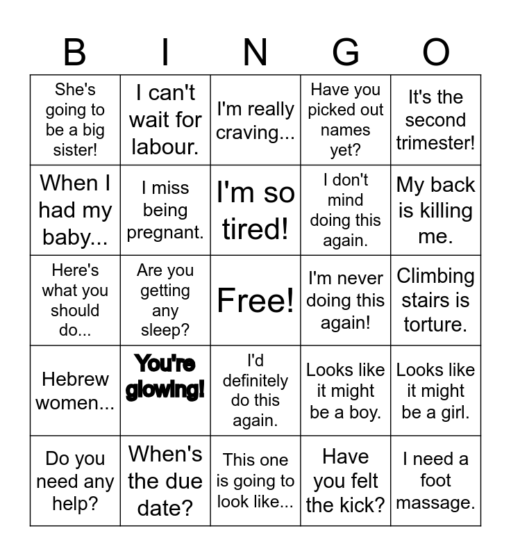 This bingo card has a free space and 24 words: You're glowing!, When's the due date?, I'm so tired!, Do you need any help?, It's the second trimester!, She's going to be a big sister!, When I had my baby..., I can't wait for labour., I'm never doing this again!, I'd definitely do this again., I don't mind doing this again., Here's what you should do..., Looks like it might be a boy., Looks like it might be a girl., I miss being pregnant., Have you felt the kick?, Climbing stairs is torture., I'm really craving..., My back is killing me., Are you getting any sleep?, I need a foot massage., Hebrew women..., Have you picked out names yet? and This one is going to look like....