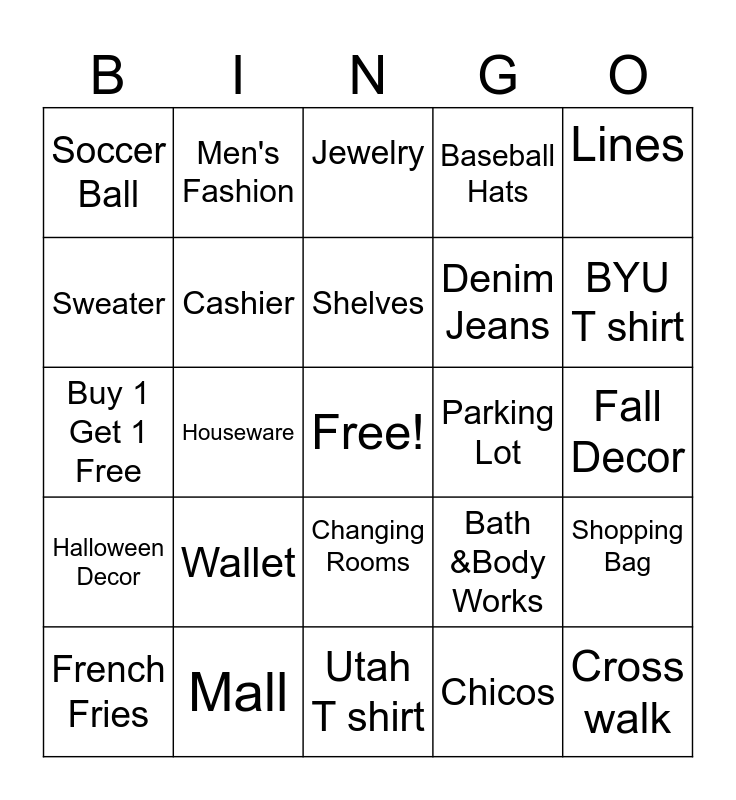 This bingo card has a free space and 24 words: Wallet, Mall, Shelves, French Fries, Lines, Soccer Ball, Sweater, Men's Fashion, Parking Lot, Changing Rooms, Denim Jeans, Buy 1 Get 1 Free, Bath &Body Works, Shopping Bag, Cashier, Chicos, Fall Decor, Jewelry, BYU T shirt, Houseware, Cross walk, Halloween Decor, Baseball Hats and Utah T shirt.
