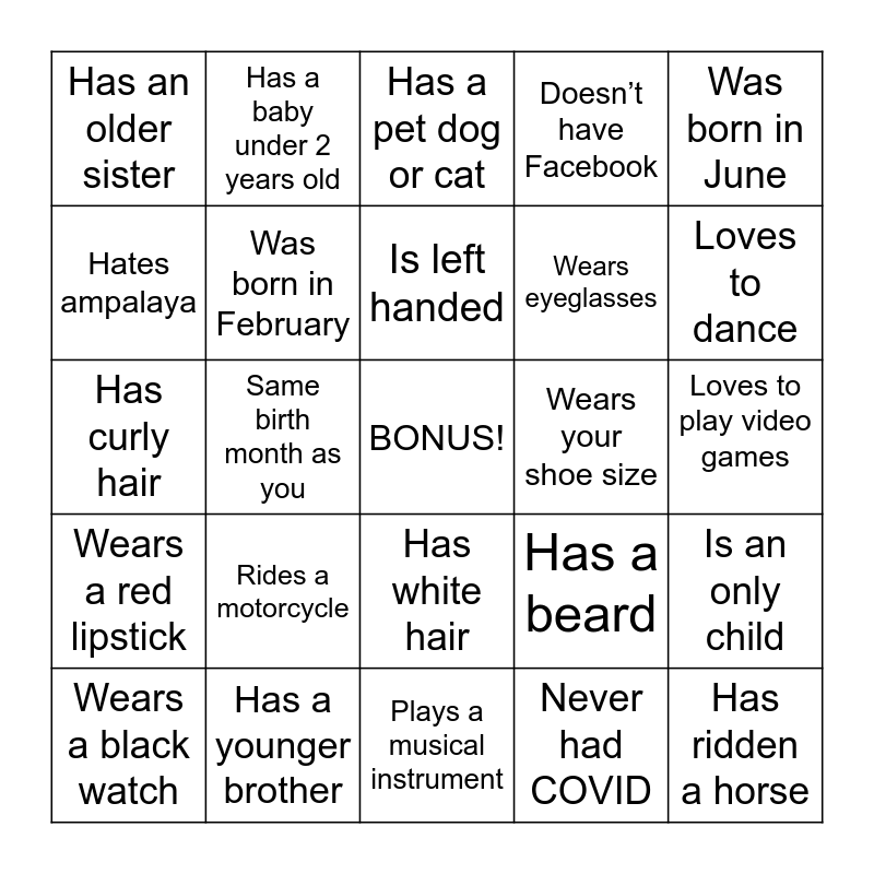 This bingo card has a free space and 24 words: Rides a motorcycle, Has a younger brother, Is left handed, Wears a black watch, Was born in June, Has an older sister, Hates ampalaya, Has a baby under 2 years old, Wears your shoe size, Has white hair, Wears eyeglasses, Has curly hair, Has a beard, Is an only child, Was born in February, Never had COVID, Loves to play video games, Has a pet dog or cat, Loves to dance, Same birth month as you, Has ridden a horse, Wears a red lipstick, Doesn’t have Facebook and Plays a musical instrument.