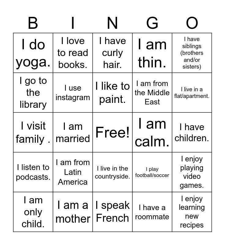 This bingo card has a free space and 29 words: I am only child., I am tall., I am married, I wear glasses., I do yoga., I have curly hair., I use instagram, I am from Latin America, I am calm., I am a mother, I have children., I enjoy learning new recipes, I speak French, I have a roommate, I live in a flat/apartment., I am shy, I live in the countryside., I listen to podcasts., I have siblings (brothers and/or sisters), I visit family ., I play football/soccer, I was born in October., I am from the Middle East, I go to the library, I am thin., I love to read books., I enjoy playing video games., I like to paint. and I go dancing..