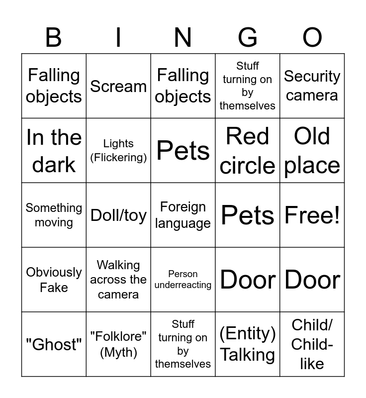 ⚠ This card has duplicate items: "Alone" (2), "Ghost" (2), Shadowy Figure (2), Door (2), Something moving (2), Child/ Child-like (2), Scream (2), Lights (Flickering) (2), Pets (2), "Unexplained noises" (2), Person underreacting (2), Person overreacting (2), Security camera (2), "Folklore" (Myth) (2), In the dark (2), Doll/toy (2), Falling objects (2), Red arrow (2), Red circle (2), Walking across the camera (2), Obviously Fake (2), Stuff turning on by themselves (2), (Entity) Talking (2), UFO (2), Ominous music (2), Dumb decision (2), Forest (2), Old place (2), Jumpscare (2), Foreign language (2), Tunnel (2), Whisper (2), Rocking object (swinging) (2)