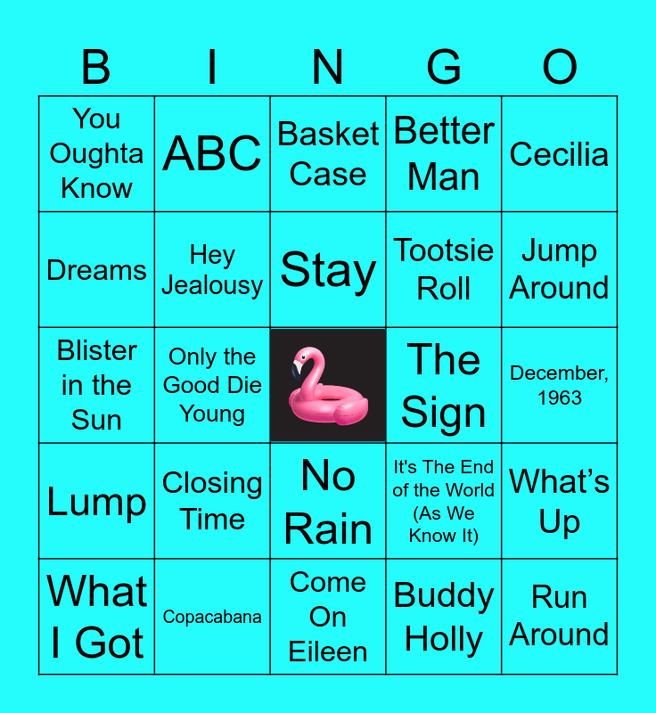 This bingo card has a free space and 30 words: Copacabana, Wanna Be, Only the Good Die Young, Brown Eyed Girl, You Oughta Know, Basket Case, Hey Jealousy, No Rain, The Sign, Come On Eileen, December, 1963, Run Around, Buddy Holly, C'mon Ride It (The Train), Jump Around, Pump Up the Jam, It's The End of the World (As We Know It), Lump, Closing Time, Cecilia, Blister in the Sun, Loser, ABC, Tootsie Roll, Dreams, Better Man, What’s Up, What I Got, Stay and Send Me On My Way.