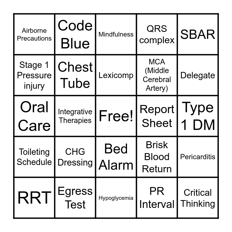 This bingo card has a free space and 34 words: Hemothorax, PR Interval, pneumothorax, External Catheter, Toileting Schedule, Chest Tube, SBAR, RRT, Code Blue, Swallow Screening, Lexicomp, Mindfulness, OB Response Team, Scrub the hubs/Curos Caps, Report Sheet, Delegate, Egress Test, Oral Care, CHG Dressing, Brisk Blood Return, Bed Alarm, CADD Pump, Airborne Precautions, Type 1 DM, Hypoglycemia, Critical Thinking, QRS complex, Neutropenia, MCA (Middle Cerebral Artery), Stage 1 Pressure injury, MRI, Integrative Therapies, Pericarditis and Avatar.