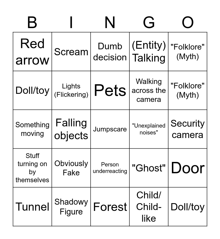 ⚠ This card has duplicate items: "Alone" (2), "Ghost" (2), Shadowy Figure (2), Door (2), Something moving (2), Child/ Child-like (2), Scream (2), Lights (Flickering) (2), Pets (2), "Unexplained noises" (2), Person underreacting (2), Person overreacting (2), Security camera (2), "Folklore" (Myth) (2), In the dark (2), Doll/toy (2), Falling objects (2), Red arrow (2), Red circle (2), Walking across the camera (2), Obviously Fake (2), Stuff turning on by themselves (2), (Entity) Talking (2), UFO (2), Ominous music (2), Dumb decision (2), Forest (2), Old place (2), Jumpscare (2), Foreign language (2), Tunnel (2), Whisper (2), Rocking object (swinging) (2)