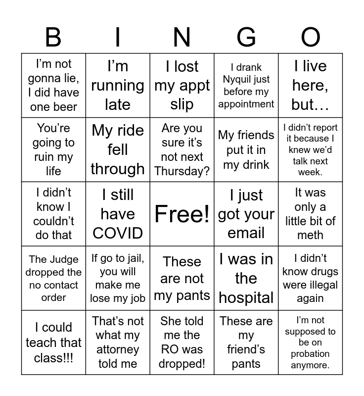 This bingo card has a free space and 25 words: If go to jail, you will make me lose my job, She told me the RO was dropped!, Are you sure it’s not next Thursday?, I could teach that class!!!, I live here, but…, I’m not gonna lie, I did have one beer, You’re going to ruin my life, I’m running late, I just got your email, These are not my pants, My friends put it in my drink, I didn’t know I couldn’t do that, I was in the hospital, I didn’t know drugs were illegal again, My ride fell through, At least it wasn’t fentanyl, It was only a little bit of meth, I lost my appt slip, I didn’t report it because I knew we’d talk next week., I still have COVID, I’m not supposed to be on probation anymore., That’s not what my attorney told me, The Judge dropped the no contact order, I drank Nyquil just before my appointment and These are my friend’s pants.