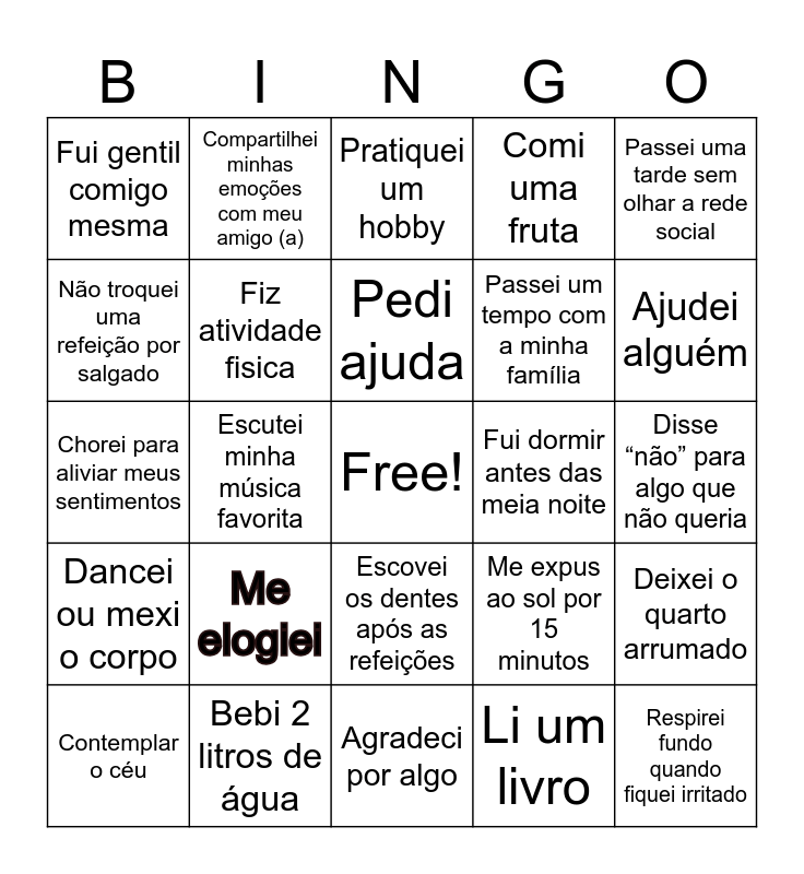 This bingo card has a free space and 24 words: Me elogiei, Bebi 2 litros de água, Pedi ajuda, Contemplar o céu, Passei uma tarde sem olhar a rede social, Fui gentil comigo mesma, Não troquei uma refeição por salgado, Compartilhei minhas emoções com meu amigo (a), Fui dormir antes das meia noite, Escovei os dentes após as refeições, Passei um tempo com a minha família, Chorei para aliviar meus sentimentos, Me expus ao sol por 15 minutos, Deixei o quarto arrumado, Fiz atividade fisica, Li um livro, Disse “não” para algo que não queria, Pratiquei um hobby, Ajudei alguém, Escutei minha música favorita, Respirei fundo quando fiquei irritado, Dancei ou mexi o corpo, Comi uma fruta and Agradeci por algo.