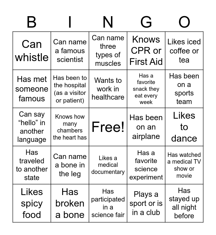 This bingo card has a free space and 60 words: Has a pet, Has broken a bone, Speaks more than one language, Has traveled to another state, Plays a sport or is in a club, Likes science class, Has been to the hospital (as a visitor or patient), Can cook a meal from scratch, Has a favorite snack they eat every week, Wears glasses or contacts, Knows CPR or First Aid, Has volunteered in the community, Has met someone famous, Enjoys reading for fun, Has a sibling, Can whistle, Has stayed up all night before, Likes iced coffee or tea, Can name all the bones in the arm, Wants to work in healthcare, Has been on an airplane, Can name three types of muscles, Likes spicy food, Has watched a medical TV show or movie, Knows their blood type, Has been in an ambulance (as a patient or visitor), Can do a cartwheel, Has taken their own pulse, Has been on a sports team, Can name the five senses, Has eaten something unusual, Likes to draw or paint, Knows the first aid steps for a burn, Has visited a zoo or aquarium, Can name a famous scientist, Likes pineapple on pizza, Has visited a farm, Knows how many chambers the heart has, Plays a musical instrument, Can say “hello” in another language, Has been camping, Can name a bone in the leg, Likes to dance, Knows how many teeth an adult human has, Has a favorite science experiment, Likes thunderstorms, Knows their zodiac sign, Has run a mile without stopping, Can name three healthy foods, Likes a medical documentary, Has participated in a science fair, Can name a muscle in the human body, Knows a fun fact about the brain, Has seen a solar eclipse, Has donated to a charity, Knows how to check their own breathing rate, Has dissected something in science class, Can roll their tongue, Likes wearing sneakers more than dress shoes and Has helped someone with a minor injury.