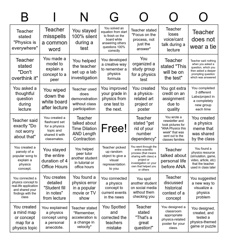 This bingo card has a free space and 58 words: You asked at least 10 other students the same physics question that no one knew the answer to., Teacher said exactly "Do not worry about that", You swept the classroom floor, You wiped down the white board after lecture, Teacher talked about Time Dilation AND Length Contraction, You spot another student on social media without them checking you, Teacher does not wear a tie, You draw a better visual model on the board better than the teacher, You made a model to explain a concept to a peer, Teacher discussed historical context of a concept, You solved an equation from start to finish on the board while answering others questions 100% correctly, You creates detailed "Student fill in notes" from lecture, You helped peer tutor another student in tutorial or office hours, You stayed the entire duration of 4 Office Hours, You Spotted and corrected the teachers mistake, Teacher stated "Physics is everywhere", Teacher stated "This will be on the test", Teacher stated "Focus on the process, not just the answer", Teacher stated "It's just simple algebra", Teacher stated "Don't overthink it", Teacher said nothing when you asked a question, which you then asked a deeper prompting question which was answered, You stayed 100% silent during a test, You completed 3 different Labs/project in a completely new group each time, You got extra credit on an assignment due to quality, You asked a question that stumped the class, You asked a thoughtful question during lecture, You created a physics meme that was shared by the class, You participated in a physics demo, You helped the teacher set up a lab investigation, You went through the entire scientific process (that means sharing with class) a project or investigation on your own that helped you or others, You related a physics concept to another subject in that teachers class, You connected a physics concept to real-life application and shared your findings with the class, Teacher stated "Remember, acceleration is a change in velocity", Teacher stated "That's a great question!", Teacher stated "get rid of your number dependency", Teacher picked up random object to give a visual representation to you, You found a physics error in a popular movie or TV show, You organized a study group for a physics test, You developed a creative way to remember a physics formula, You connected a physics concept to current events in the news, Teacher used does demonstration without class participation, You designed, created, and tested a physics-themed game or puzzle, You created a physics-related art project or poster, You created a comic strip or storyboard illustrating a physics concept, You suggested a new way to visualize a physics problem, You created a mind map or concept map for a physics topic, You explained a physics concept using a personal anecdote., You improved your grade in physics from one test to the next., You created a flashcard set for a physics topic and shared it with classmates., You designed a classroom appropriate physics-related poster for your class., You found a physics resource (simulation, game, video, article, etc) that the teacher used in class later, You wrote a newsletter and took pictures for "ANA Physics this week" that was sent out to the classes families, You created a parody of a popular song to explain a physics concept., Teacher talked about personal life before ANA, Teacher misspells a common word, Teacher talked about Sci-Fi Technology or Super powers, Teacher loses voice/cant talk during a lecture and Teacher stated "Am I good to move on?".