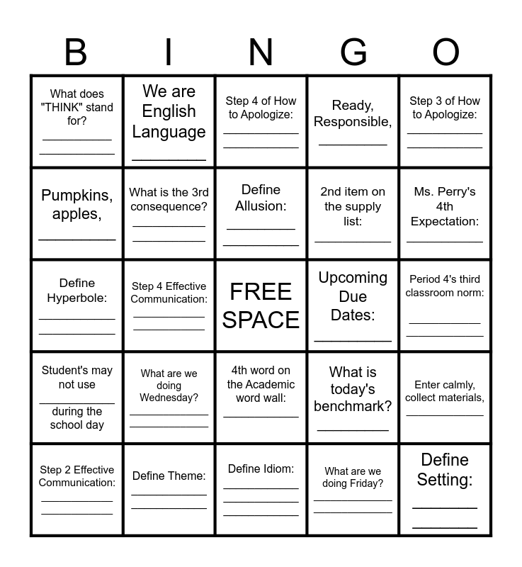 This bingo card has a free space and 24 words: What are we doing Wednesday? ______________ ______________, Define Theme: ____________ ____________, Define Allusion: _________ __________, Step 2 Effective Communication: ____________ ____________, Step 3 of How to Apologize: ____________ ____________, What does "THINK" stand for? ___________ ____________, Pumpkins, apples, _________, We are English Language ________, Upcoming Due Dates: _________, 4th word on the Academic word wall: ____________, 2nd item on the supply list: ___________, Define Hyperbole: ___________ ___________, What is today's benchmark? _________, Enter calmly, collect materials, _____________, What is the 3rd consequence? ___________ ___________, What are we doing Friday? ______________ ______________, Period 4's third classroom norm: ____________ _____________, Step 4 of How to Apologize: ____________ ____________, Ms. Perry's 4th Expectation: ___________, Step 4 Effective Communication: ____________ ____________, Define Setting: _______ _______, Student's may not use ____________ during the school day, Ready, Responsible, _________ and Define Idiom: ____________ ____________ ____________.