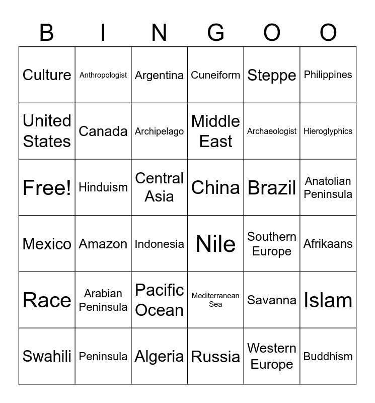 This bingo card has 36 words: Mediterranean Sea, Pacific Ocean, Russia, United States, Mexico, China, Canada, Algeria, Steppe, Savanna, Hieroglyphics, Cuneiform, Islam, Hinduism, Middle East, Culture, Race, Brazil, Free!, Argentina, Central Asia, Amazon, Nile, Indonesia, Southern Europe, Anthropologist, Archaeologist, Peninsula, Archipelago, Philippines, Buddhism, Swahili, Afrikaans, Anatolian Peninsula, Arabian Peninsula and Western Europe.