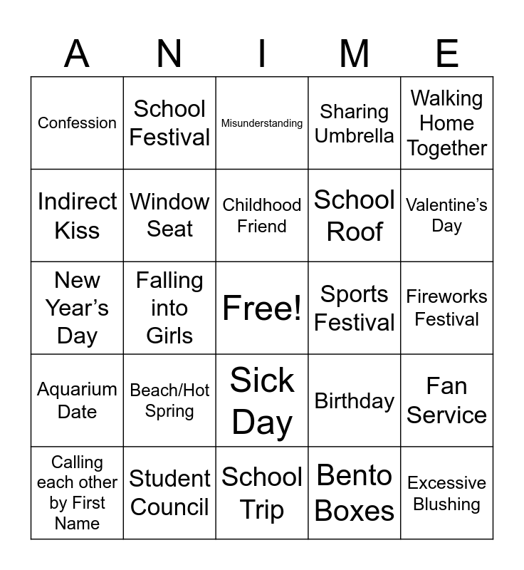 This bingo card has a free space and 24 words: Beach/Hot Spring, Student Council, Childhood Friend, Calling each other by First Name, Walking Home Together, Confession, Indirect Kiss, School Festival, Sports Festival, Sick Day, School Roof, New Year’s Day, Birthday, Fan Service, Window Seat, Bento Boxes, Fireworks Festival, Misunderstanding, Valentine’s Day, Falling into Girls, Excessive Blushing, Aquarium Date, Sharing Umbrella and School Trip.