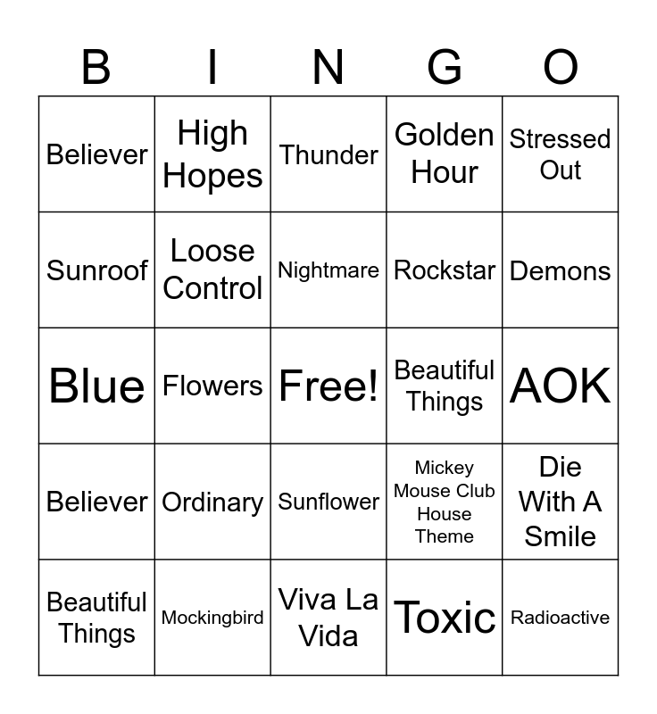 This bingo card has a free space and 26 words: Sunflower, Toxic, Nightmare, Mockingbird, Stressed Out, Believer, Sunroof, High Hopes, AOK, Mickey Mouse Club House Theme, Rockstar, Blue, Die With A Smile, Beautiful Things, Flowers, Birds of Feather, Golden Hour, Believer, Thunder, Radioactive, Demons, Viva La Vida, Beautiful Things, Ordinary, Loose Control and Anxiety.