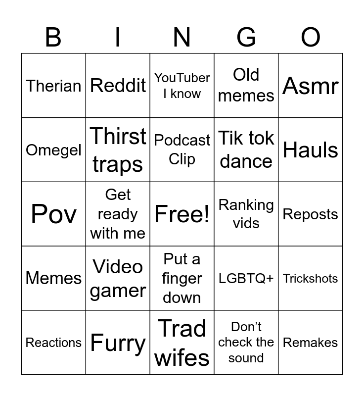 This bingo card has a free space and 24 words: Video gamer, Furry, Podcast Clip, Reactions, Asmr, Therian, Omegel, Reddit, Ranking vids, Put a finger down, Tik tok dance, Pov, LGBTQ+, Trickshots, Thirst traps, Don’t check the sound, Reposts, YouTuber I know, Hauls, Get ready with me, Remakes, Memes, Old memes and Trad wifes.