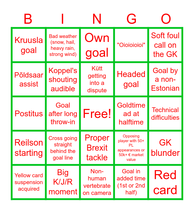 This bingo card has a free space and 41 words: "Niiiii", Postitus, Soft penalty, Koppel's shouting audible, Big K/J/R moment, Proper Brexit tackle, Kütt getting into a dispute, Goal from outside the box, Soft foul call on the GK, Reilson starting, Goal after long throw-in, "Oioioioioi", Red card, Technical difficulties, Goldtime ad at halftime, Cross going straight behind the goal line, Okoro dribbling past 2+ players, Kruusla goal, Lord/Leslie~Opti effect (Elva~Opponent goal within 10 min of one of them joining), Own goal, GK blunder, Headshot (player, official or spectator), Non-human vertebrate on camera, Headed goal, Child ultra choir chanting/singing, Player slipping/tripping without interference, Goal in added time (1st or 2nd half), Air horn, Goal by a non-Estonian, Mafia (clearly wrong call against Elva), Cameraman not following the action, Bad weather (snow, hail, heavy rain, strong wind), Yellow card suspension acquired, Betting addict rage in chat, Opposing player with 50+ PL appearances or 50k+ € market value, Põldsaar assist, Countercounter, Ball boy juggling, Attendance above home team season average, Either team scoring with their 1st shot of either half and Nutmeg.