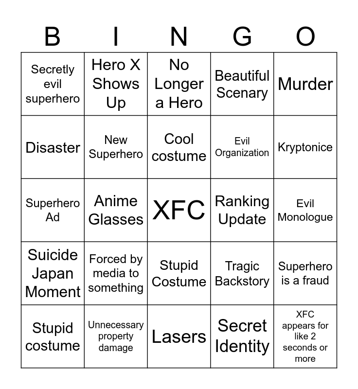 This bingo card has a free space and 24 words: Forced by media to something, Unnecessary property damage, Cool costume, Stupid costume, Murder, Secretly evil superhero, Disaster, Hero X Shows Up, Ranking Update, Stupid Costume, Evil Organization, Superhero Ad, Tragic Backstory, Superhero is a fraud, New Superhero, Secret Identity, Evil Monologue, No Longer a Hero, Kryptonice, Anime Glasses, XFC appears for like 2 seconds or more, Suicide Japan Moment, Beautiful Scenary and Lasers.