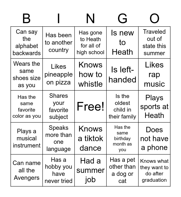 This bingo card has a free space and 24 words: Speaks more than one language, Has a hobby you have never tried, Knows how to whistle, Can name all the Avengers, Traveled out of state this summer, Can say the alphabet backwards, Wears the same shoes size as you, Has been to another country, Is the oldest child in their family, Knows a tiktok dance, Is left-handed, Has the same favorite color as you, Has the same birthday month as you, Does not have a phone, Likes pineapple on pizza, Has a pet other than a dog or cat, Plays sports at Heath, Has gone to Heath for all of high school, Likes rap music, Shares your favorite subject, Knows what they want to do after graduation, Plays a musical instrument, Is new to Heath and Had a summer job.