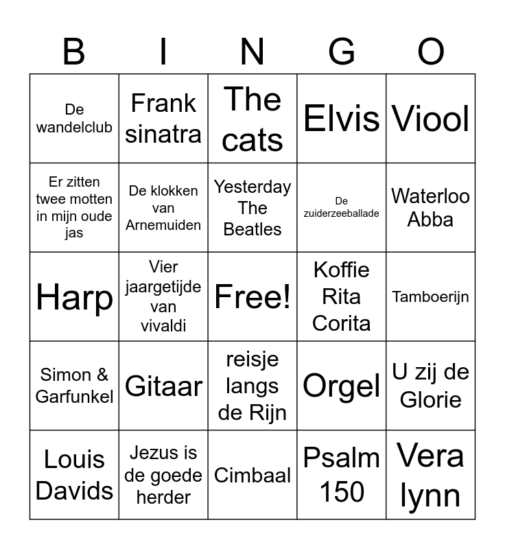 This bingo card has a free space and 24 words: Gitaar, Jezus is de goede herder, Yesterday The Beatles, Louis Davids, Viool, De wandelclub, Er zitten twee motten in mijn oude jas, Frank sinatra, Koffie Rita Corita, reisje langs de Rijn, De zuiderzeeballade, Harp, Orgel, U zij de Glorie, De klokken van Arnemuiden, Psalm 150, Tamboerijn, The cats, Waterloo Abba, Vier jaargetijde van vivaldi, Vera lynn, Simon & Garfunkel, Elvis and Cimbaal.