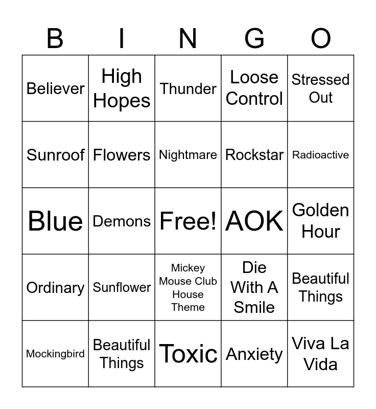 This bingo card has a free space and 25 words: Sunflower, Toxic, Nightmare, Mockingbird, Stressed Out, Believer, Sunroof, High Hopes, AOK, Mickey Mouse Club House Theme, Rockstar, Blue, Die With A Smile, Beautiful Things, Flowers, Birds of Feather, Golden Hour, Thunder, Radioactive, Demons, Viva La Vida, Beautiful Things, Ordinary, Loose Control and Anxiety.