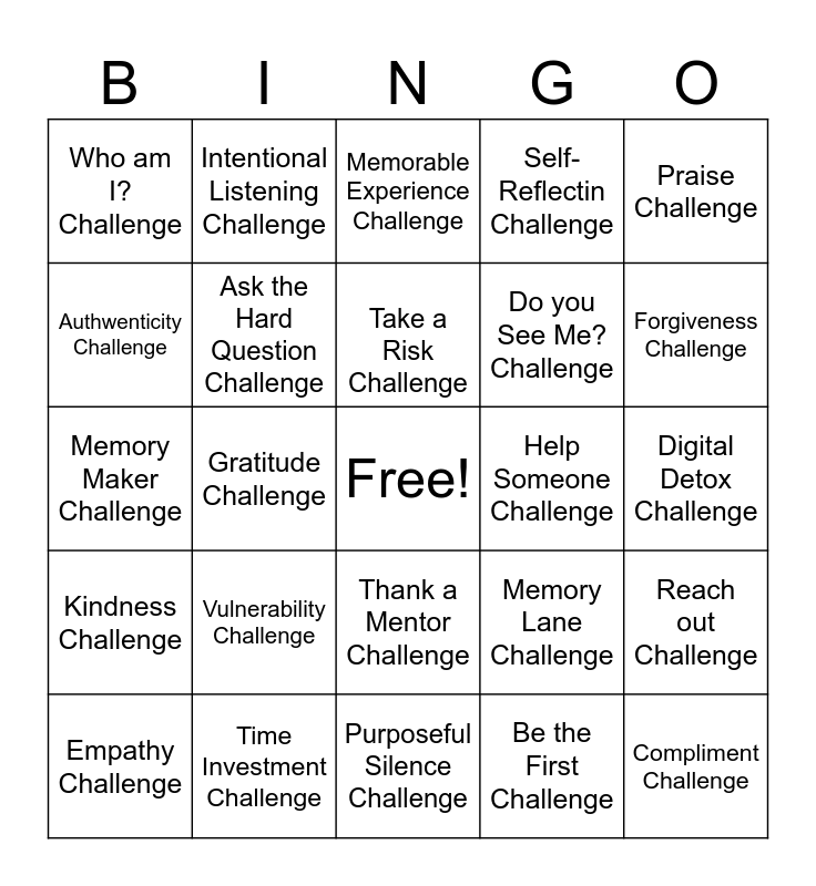This bingo card has a free space and 24 words: Vulnerability Challenge, Time Investment Challenge, Take a Risk Challenge, Empathy Challenge, Praise Challenge, Who am I? Challenge, Authwenticity Challenge, Intentional Listening Challenge, Help Someone Challenge, Thank a Mentor Challenge, Do you See Me? Challenge, Memory Maker Challenge, Memory Lane Challenge, Reach out Challenge, Ask the Hard Question Challenge, Be the First Challenge, Digital Detox Challenge, Memorable Experience Challenge, Forgiveness Challenge, Gratitude Challenge, Compliment Challenge, Kindness Challenge, Self-Reflectin Challenge and Purposeful Silence Challenge.