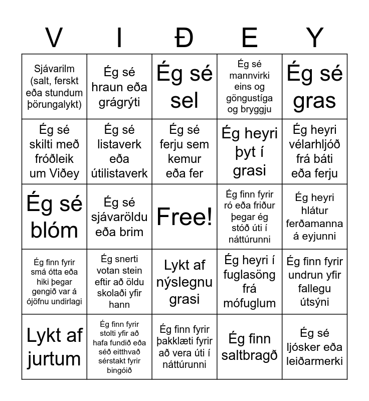 This bingo card has a free space and 76 words: Ég sé lunda, Ég sé æðarfugl, Ég sé sel, Ég sé skel, Ég sé þang, Ég sé Viðeyjarstofu, Ég sé Viðeyjarkirkju, Ég sé minjar af gömlum húsum eða klaustri, Ég sé rústir og steinlög í jörðu, Ég sé röndótta fjörusteina, Ég sé þang og söl í fjörunni, Ég sé selur á steini eða í sjónum, Ég sé ferju sem kemur eða fer, Ég sé skilti með fróðleik um Viðey, Ég sé fjallasýn til Esjunnar, Ég sé sjávaröldu eða brim, Ég sé litla báta eða kajaka, Ég sé ljósker eða leiðarmerki, Ég sé sandur eða möl í fjörunni, Ég sé gras, Ég sé lyng, Ég sé blóm, Ég sé listaverk eða útilistaverk, Ég sé hraun eða grágrýti, Ég sé mannvirki eins og göngustíga og bryggju, Ég sé fólk í göngu eða með nesti, Ég heyri fótatak á möl, Ég heyri í fuglum í fjarska, Ég heyri í öldum skella á ströndinni, Ég heyri í mávum, Ég heyri í kríum, Ég heyri í brimi sem skellur á klettum, Ég heyri í öldum sem skolast upp í fjöruna, Ég heyri í fuglasöng frá mófuglum, Ég heyri vélarhljóð frá báti eða ferju, Ég heyri þyt í grasi, Ég heyri í vindinum, Ég heyri fjarlægt mannamál eða, Ég heyri hlátur ferðamanna á eyjunni, Ég finn saltbragð, Saltbragð á vörum eftir fjöruleiki, Söl (þurrkuð eða fersk úr fjörunni), Ég finn bragð af vatni, Ég finn bragð af jurtum, Ég finn bragð af nestinu mínu, Lykt af þangi, Lykt af jurtum, Sjávarilm (salt, ferskt eða stundum þörungalykt), Lykt af þangi eða söl í fjöru, Lykt af votum steinum eða sandi, Lykt af blómum (t.d. gulmaðra eða holtasóley), Lykt af nýslegnu grasi, Lykt af villtum jurtum á eyjunni, Lykt af olíu eða útblæstri frá ferju/bát, Ég snerti sléttan steinn, Ég snerti skel í fjörunni, Ég snerti grófan klett eða hraun, Ég snerti blautt þang eða söl, Ég snerti sandur eða möl sem rann í gegnum fingurna, Ég snerti gras og strá, Ég snerti votan stein eftir að öldu skolaði yfir hann, Ég snerti hraunmola sem er hvass á köntunum, Ég snerti mjúkan mosa á steini, Ég snerti við eða járn á bryggju, Ég fann mun á mjúku og hörðu undirlagi, Ég finn fyrir spenningi við að fara í ferjuna, Ég finn fyrir ró eða friður þegar ég stóð úti í náttúrunni, Ég finn fyrir kuldahrolli í vindinum, Ég finn fyrir gleði þegar ég sá dýr eða fugl nálægt mér, Ég finn fyrir forvitni þegar ég uppgötva eitthvað nýtt, Ég finn fyrir undrun yfir fallegu útsýni, Ég finn fyrir smá ótta eða hiki þegar gengið var á ójöfnu undirlagi, Ég finn fyrir stolti yfir að hafa fundið eða séð eitthvað sérstakt fyrir bingóið, Ég finn fyrir kraumandi hlátri með vinum í hópnum, Ég finn fyrir þakklæti fyrir að vera úti í náttúrunni and Ég finn fyrir innri ró.