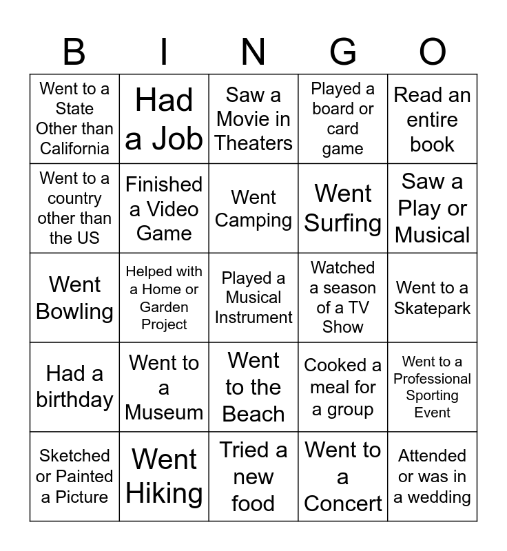 This bingo card has a free space and 24 words: Went to a Museum, Went Hiking, Went Camping, Sketched or Painted a Picture, Read an entire book, Went to a State Other than California, Went to a country other than the US, Had a Job, Watched a season of a TV Show, Went to the Beach, Went Surfing, Went Bowling, Cooked a meal for a group, Went to a Professional Sporting Event, Finished a Video Game, Went to a Concert, Went to a Skatepark, Saw a Movie in Theaters, Saw a Play or Musical, Helped with a Home or Garden Project, Attended or was in a wedding, Had a birthday, Played a board or card game and Tried a new food.