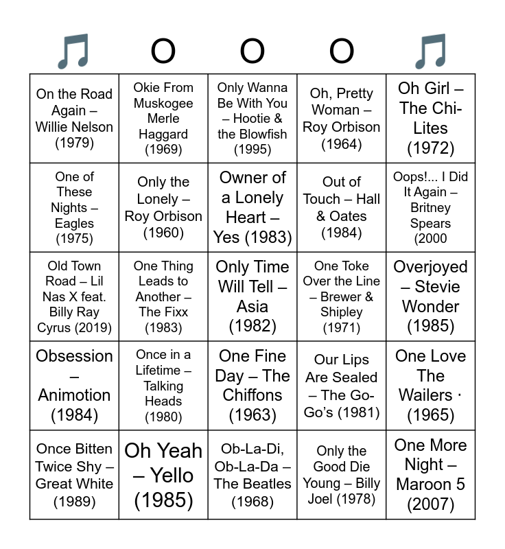 This bingo card has 35 words: Only You (And You Alone) – The Platters (1955), Oh! Carol – Neil Sedaka (1959), Oh Boy! – Buddy Holly & The Crickets (1957), Only the Lonely – Roy Orbison (1960), One Fine Day – The Chiffons (1963), Oh, Pretty Woman – Roy Orbison (1964), One of These Nights – Eagles (1975), One Way or Another – Blondie (1979), Owner of a Lonely Heart – Yes (1983), Oops!... I Did It Again – Britney Spears (2000), Old Town Road – Lil Nas X feat. Billy Ray Cyrus (2019), Oh Girl – The Chi-Lites (1972), Old Time Rock and Roll – Bob Seger & The Silver (1979), On Broadway – George Benson (1978), On the Road Again – Willie Nelson (1979), One Toke Over the Line – Brewer & Shipley (1971), Only the Good Die Young – Billy Joel (1978), One Thing Leads to Another – The Fixx (1983), Obsession – Animotion (1984), Only Time Will Tell – Asia (1982), Our Lips Are Sealed – The Go-Go’s (1981), Once Bitten Twice Shy – Great White (1989), One Love The Wailers ‧ (1965), Oh Yeah – Yello (1985), Only Wanna Be With You – Hootie & the Blowfish (1995), Oops!... I Did It Again – Britney Spears (2000, One More Night – Maroon 5 (2007), One Night – Elvis Presley (1958), Out of Touch – Hall & Oates (1984), Overjoyed – Stevie Wonder (1985), "On the Radio" Donna Summer – (1979), Ob-La-Di, Ob-La-Da – The Beatles (1968), Once in a Lifetime – Talking Heads (1980), Okie From Muskogee Merle Haggard (1969) and One Three Dog Night (1969).