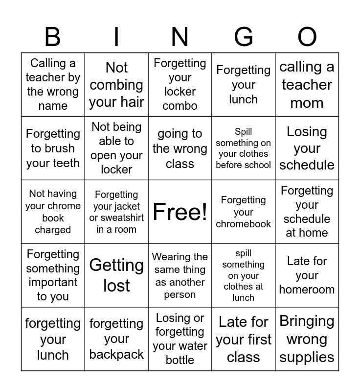 This bingo card has a free space and 24 words: Getting lost, forgetting your backpack, going to the wrong class, forgetting your lunch, calling a teacher mom, Calling a teacher by the wrong name, Forgetting to brush your teeth, Not combing your hair, Forgetting your chromebook, Wearing the same thing as another person, Spill something on your clothes before school, Not having your chrome book charged, spill something on your clothes at lunch, Late for your homeroom, Not being able to open your locker, Late for your first class, Forgetting your schedule at home, Forgetting your locker combo, Losing your schedule, Forgetting your jacket or sweatshirt in a room, Bringing wrong supplies, Forgetting something important to you, Forgetting your lunch and Losing or forgetting your water bottle.