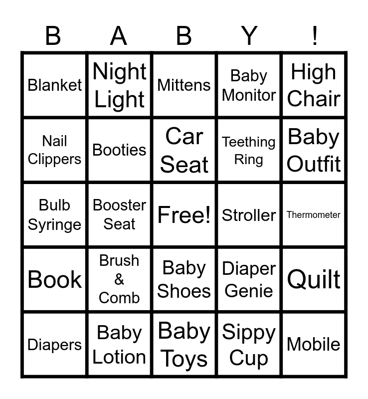 This bingo card has a free space and 56 words: Bottle Warmer, Diapers, Bib, Blanket, Baby Toys, Pacifier, Booties, Onesie, Teething Ring, Diaper Cream, Baby Monitor, Diaper Bag, Changing Pad, Car Sun Shade, Bath Toys, Crib, High Chair, Booster Seat, Bassinet, Mobile, Stroller, Sleep Sack, Diaper Genie, Mittens, Bottle, Car Seat, Hat, Socks, Baby Outfit, Baby Sling, Baby Bouncer, Swing, Rocking Chair, Bottle Sterilizer, Thermometer, Nail Clippers, Bulb Syringe, Stuffed Animal, Book, Night Light, Baby Shoes, Wipes, Wash Cloths, Baby Wipes, Infant Tub, Brush & Comb, Baby Lotion, Crib Sheets, Activity Mat, Burp Cloths, Sippy Cup, Teether, Photo Album, Safety Gate, Quilt and Baby Journal.