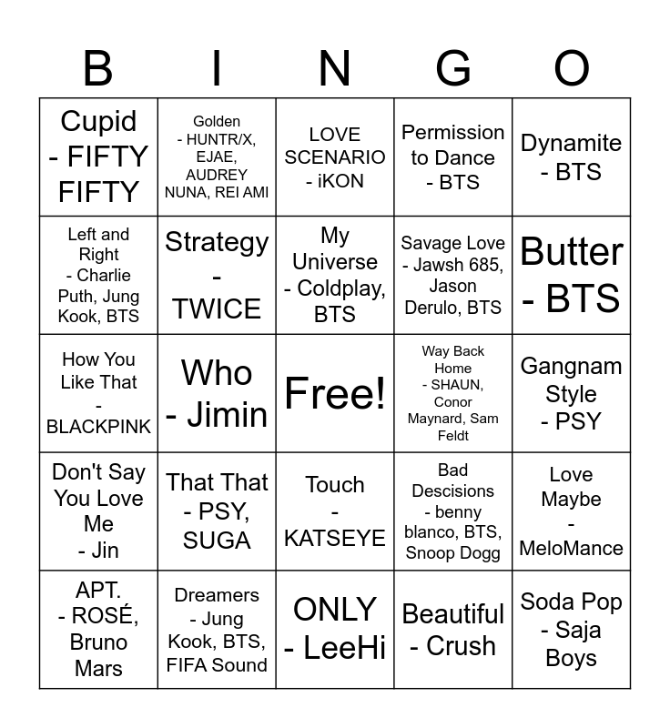This bingo card has a free space and 24 words: That That - PSY, SUGA, Dreamers - Jung Kook, BTS, FIFA Sound, My Universe - Coldplay, BTS, APT. - ROSÉ, Bruno Mars, Dynamite - BTS, Cupid - FIFTY FIFTY, Left and Right - Charlie Puth, Jung Kook, BTS, Golden - HUNTR/X, EJAE, AUDREY NUNA, REI AMI, Way Back Home - SHAUN, Conor Maynard, Sam Feldt, Touch - KATSEYE, Savage Love - Jawsh 685, Jason Derulo, BTS, How You Like That - BLACKPINK, Bad Descisions - benny blanco, BTS, Snoop Dogg, Love Maybe - MeloMance, Strategy - TWICE, Beautiful - Crush, Gangnam Style - PSY, LOVE SCENARIO - iKON, Butter - BTS, Who - Jimin, Soda Pop - Saja Boys, Don't Say You Love Me - Jin, Permission to Dance - BTS and ONLY - LeeHi.