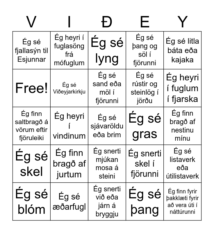 This bingo card has 60 words: Ég sé lunda, Ég sé æðarfugl, Ég sé sel, Ég sé skel, Ég sé þang, Ég sé Viðeyjarstofu, Ég sé Viðeyjarkirkju, Ég sé minjar af gömlum húsum eða klaustri, Ég sé rústir og steinlög í jörðu, Ég sé röndótta fjörusteina, Ég sé þang og söl í fjörunni, Ég sé selur á steini eða í sjónum, Free!, Ég sé ferju sem kemur eða fer, Ég sé skilti með fróðleik um Viðey, Ég sé fjallasýn til Esjunnar, Ég sé sjávaröldu eða brim, Ég sé litla báta eða kajaka, Ég sé ljósker eða leiðarmerki, Ég sé sand eða möl í fjörunni, Ég sé gras, Ég sé lyng, Ég sé blóm, Ég sé listaverk eða útilistaverk, Ég sé hraun eða grágrýti, Ég sé mannvirki eins og göngustíga og bryggju, Ég sé fólk í göngu eða með nesti, Ég heyri fótatak á möl, Ég heyri í fuglum í fjarska, Ég heyri í öldum skella á ströndinni, Ég heyri í mávum, Ég heyri í kríum, Ég heyri í brimi sem skellur á klettum, Ég heyri í öldum sem skolast upp í fjöruna, Ég heyri í fuglasöng frá mófuglum, Ég heyri vélarhljóð frá báti eða ferju, Ég heyri þyt í grasi, Ég heyri í vindinum, Ég heyri fjarlægt mannamál eða, Ég finn saltbragð á vörum eftir fjöruleiki, Ég finn bragð af vatni, Ég finn bragð af jurtum, Ég finn bragð af nestinu mínu, Ég snerti sléttan steinn, Ég snerti skel í fjörunni, Ég snerti grófan klett eða hraun, Ég snerti blautt þang eða söl, Ég snerti votan stein eftir að öldu skolaði yfir hann, Ég snerti hraunmola sem er hvass á köntunum, Ég snerti mjúkan mosa á steini, Ég snerti við eða járn á bryggju, Ég finn fyrir spenningi við að fara í ferjuna, Ég finn fyrir kuldahrolli í vindinum, Ég finn fyrir forvitni þegar ég uppgötva eitthvað nýtt, Ég verð agndofa yfir fallegu útsýni, Ég finn fyrir smá ótta eða hiki þegar gengið var á ójöfnu undirlagi, Ég finn fyrir stolti yfir að hafa fundið eða séð eitthvað sérstakt fyrir bingóið, Ég finn fyrir kraumandi hlátri með vinum í hópnum, Ég finn fyrir þakklæti fyrir að vera úti í náttúrunni and Ég finn fyrir innri ró.