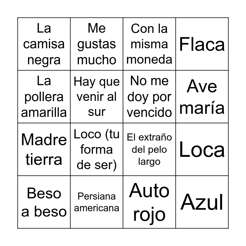 This bingo card has 102 words: Free!, Ahora te puedes marchar, La pollera amarilla, Fuiste, No me arrepiento de este amor, Culpable o no, Prófugos, La felicidad, Gracias a la vida, Rosa, rosa, Vivir así es morir de amor, Despacito, Dancing queen, Un velero llamado libertad, Mayonesa, Lloviendo estrellas, Azul, La isla bonita, Waka waka, Yo me enamore, Suavemente, Mentirosa, Por amarte así, Mariposa tecknicolor, Costumbres argentinas, Loco (tu forma de ser), Flaca, Take on me, Sin vergüenza, Lunes por la madrugada, Me gustas mucho, Con la misma moneda, Avanti morocha, Tu misterioso alguien, Mírenla, Lo mejor del amor, Color esperanza, Meneaito, El extraño del pelo largo, El amor después del amor, Luna de miel en la Mano, Nos siguen pegando abajo, No podrás, Girls just want to have fun, Macarena, Torero, Una cerveza, Madre tierra, La ventanita, Un beso y una flor, Garganta con arena, La guitarra, Hay que venir al sur, Pedro, Asereje, A quien le importa, Todos me miran, Ciudad mágica, Mil horas, Beso a beso, Olvidame y pega la vuelta, Hacerlo por mi, Suerte, Juntos a la par, Mujer amante, Salomé, La mordidita, Auto rojo, Loca, Dejaría todo, El bombón asesino, Amiga mía, Otra como tu, Colgando en tus manos, La chica del bikini azul, Deseos de cosas imposibles, No me doy por vencido, Don, Señora de mas cuatro decadas, Limón y sal, Herederos, Tu recuerdo, Cae el sol, Persiana americana, Corazón valiente, Ave maría, Buleria, Nunca quise, Samba de janeiroh, Hacer un puente, Ocho cuarenta, Amor clasificado, Ese maldito momento, Madrugada, Soy cordobes, Quien se tomo todo el vino?, La camisa negra, A dios le pido, Man! I feel like a woman!, Humanos a marte, Es por ti and Samba de janeiro.