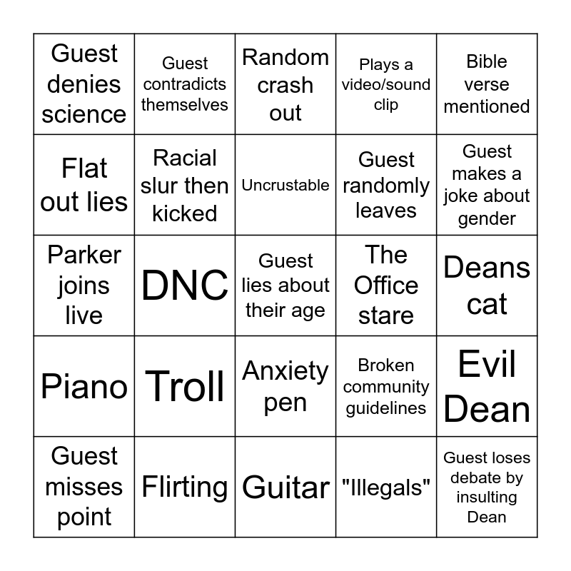 This bingo card has a free space and 24 words: Troll, Flirting, Uncrustable, Guest misses point, Bible verse mentioned, Guest denies science, Flat out lies, Guest contradicts themselves, The Office stare, Anxiety pen, Guest randomly leaves, Parker joins live, Broken community guidelines, Evil Dean, Racial slur then kicked, "Illegals", Deans cat, Random crash out, Guest makes a joke about gender, DNC, Guest loses debate by insulting Dean, Piano, Plays a video/sound clip and Guitar.