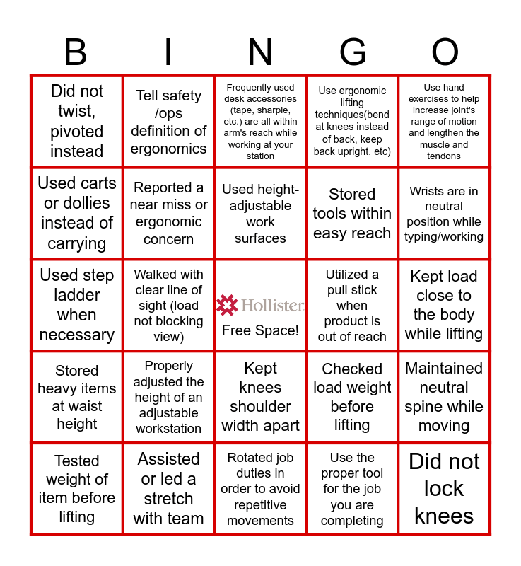 This bingo card has a free space and 43 words: Attended Tier Meeting, Did not lock knees, Participated in Start of Shift Stretches, Tested weight of item before lifting, Maintained good posture during the work day to reduce discomfort, pain or fatigue, Use the proper tool for the job you are completing, Frequently used desk accessories (tape, sharpie, etc.) are all within arm's reach while working at your station, Eyes are at the same level of the top of your computer screen to prevent excessive neck movement, Use hand exercises to help increase joint's range of motion and lengthen the muscle and tendons, Assisted or led a stretch with team, Use ergonomic lifting techniques(bend at knees instead of back, keep back upright, etc), Utilized a pull stick when product is out of reach, Kept knees shoulder width apart, Properly adjusted the height of an adjustable workstation, Have participated in an Ergonomic Team activity (this sheet counts!), Rotated job duties in order to avoid repetitive movements, Utilized team lift when necessary, Used step ladder when necessary, Gave 1 ergonomic friendly tip to a member of safety/ops, Wrists are in neutral position while typing/working, Tell safety /ops definition of ergonomics, Stayed in Power Zone, Coached a peer on safe lifting technique, Did not twist, pivoted instead, Used legs (not back) to lift a load, Kept load close to the body while lifting, Used mechanical aid (e.g., pallet jack, lift assist), Broke down a heavy load into smaller parts, Checked load weight before lifting, Stored heavy items at waist height, Used proper grip (whole hand, not fingertips), Maintained neutral spine while moving, Took a break after repetitive lifting, Walked with clear line of sight (load not blocking view), Used proper footwear with good support, Avoided overreaching or awkward postures, Inspected equipment before use, Used height-adjustable work surfaces, Used carts or dollies instead of carrying, Stored tools within easy reach, Reported damaged or missing ergonomic tools, Reported a near miss or ergonomic concern and Suggested an ergonomic improvement.