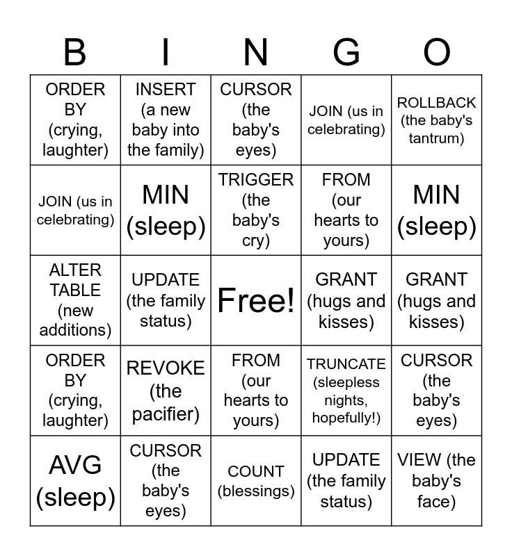 This bingo card has a free space and 72 words: SELECT (the perfect gift), INSERT (a new baby into the family), UPDATE (the family status), CREATE TABLE (family tree), PRIMARY KEY (baby's name), FOREIGN KEY (sibling's name), JOIN (us in celebrating), WHERE (love grows), FROM (our hearts to yours), COUNT (blessings), AVG (sleep), MAX (joy), MIN (sleep), ORDER BY (crying, laughter), GROUP BY (family), ALTER TABLE (new additions), TRUNCATE (sleepless nights, hopefully!), ROLLBACK (the baby's tantrum), COMMIT (to being great parents), GRANT (hugs and kisses), REVOKE (the pacifier), VIEW (the baby's face), CURSOR (the baby's eyes), TRIGGER (the baby's cry), TRUNCATE (sleepless nights, hopefully!), ROLLBACK (the baby's tantrum), COMMIT (to being great parents), GRANT (hugs and kisses), REVOKE (the pacifier), VIEW (the baby's face), CURSOR (the baby's eyes), TRIGGER (the baby's cry), SELECT (the perfect gift), INSERT (a new baby into the family), UPDATE (the family status), CREATE TABLE (family tree), PRIMARY KEY (baby's name), FOREIGN KEY (sibling's name), JOIN (us in celebrating), WHERE (love grows), FROM (our hearts to yours), COUNT (blessings), AVG (sleep), MAX (joy), MIN (sleep), ORDER BY (crying, laughter), GROUP BY (family), ALTER TABLE (new additions), SELECT (the perfect gift), INSERT (a new baby into the family), UPDATE (the family status), CREATE TABLE (family tree), COMMIT (to being great parents), GRANT (hugs and kisses), REVOKE (the pacifier), VIEW (the baby's face), CURSOR (the baby's eyes), TRIGGER (the baby's cry), PRIMARY KEY (baby's name), FOREIGN KEY (sibling's name), JOIN (us in celebrating), WHERE (love grows), FROM (our hearts to yours), COUNT (blessings), AVG (sleep), MAX (joy), MIN (sleep), ORDER BY (crying, laughter), GROUP BY (family), ALTER TABLE (new additions), TRUNCATE (sleepless nights, hopefully!) and ROLLBACK (the baby's tantrum).