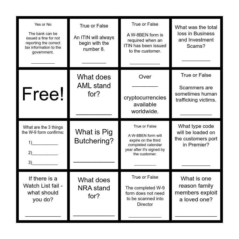 This bingo card has 16 words: What does NRA stand for? ___________, What type code will be loaded on the customers port in Premier? __________, True or False A W-8BEN form is required when an ITIN has been issued to the customer. ____________, Yes or No The bank can be issued a fine for not reporting the correct tax information to the government. ___________, What are the 3 things the W-9 form confirms: 1)___________ 2)___________ 3)___________, True or False An ITIN will always begin with the number 8. _________, True or False A W-8BEN form will expire on the third completed calendar year after it's signed by the customer. __________, True or False The completed W-9 form does not need to be scanned into Director _____________, Free!, What does AML stand for? _________, If there is a Watch List fail - what should you do? ___________, What was the total loss in Business and Investment Scams? __________, What is Pig Butchering? __________, True or False Scammers are sometimes human trafficking victims. ___________, Over ________ cryptocurrencies available worldwide. and What is one reason family members exploit a loved one? _____________.