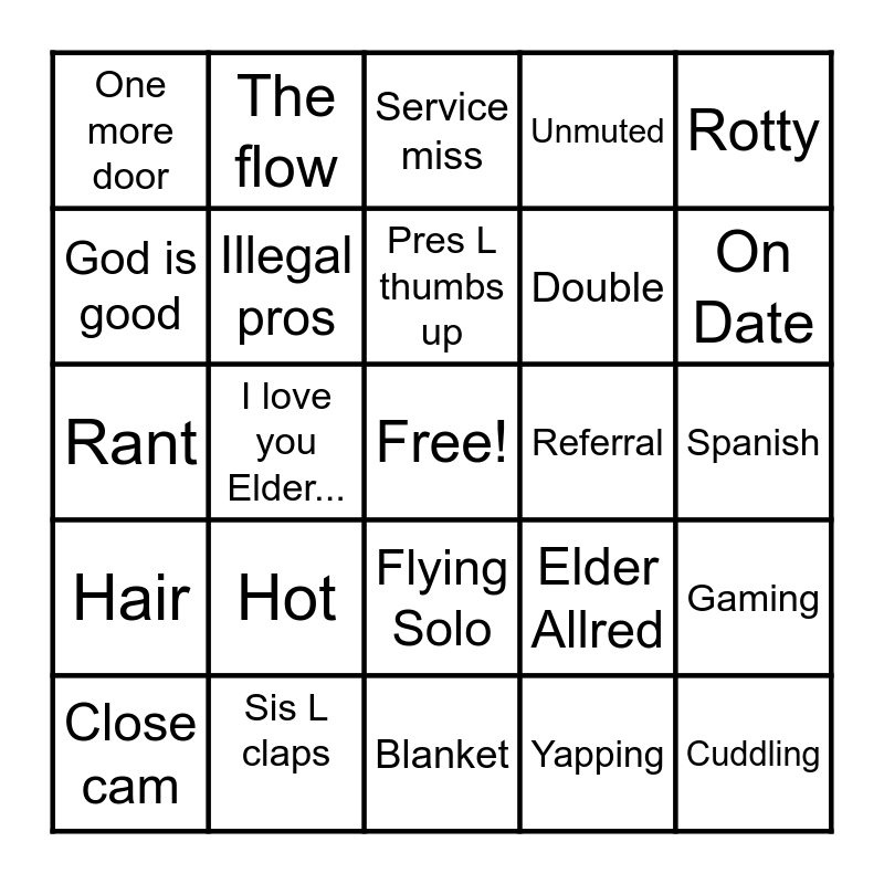 This bingo card has a free space and 24 words: Hot, Sis L claps, Pres L thumbs up, Close cam, Rotty, One more door, God is good, The flow, Referral, Flying Solo, Double, Rant, Elder Allred, Gaming, Illegal pros, Yapping, Spanish, Service miss, On Date, I love you Elder..., Cuddling, Hair, Unmuted and Blanket.