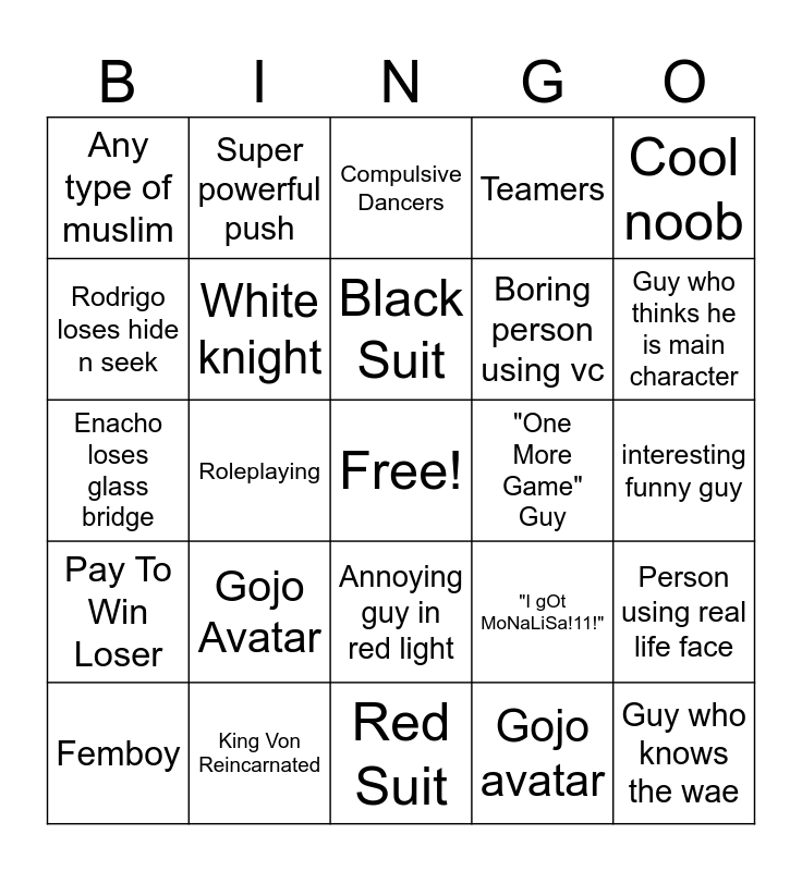 This bingo card has a free space and 25 words: Gojo Avatar, Red Suit, Black Suit, Femboy, Cool noob, Any type of muslim, Rodrigo loses hide n seek, Super powerful push, "One More Game" Guy, Annoying guy in red light, Boring person using vc, Enacho loses glass bridge, "I gOt MoNaLiSa!11!", Person using real life face, White knight, Pushed taking photo, interesting funny guy, Compulsive Dancers, Guy who thinks he is main character, Roleplaying, Guy who knows the wae, King Von Reincarnated, Pay To Win Loser, Teamers and Gojo avatar.