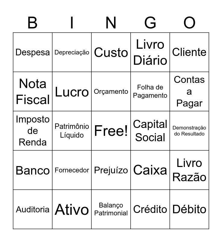 This bingo card has a free space and 30 words: Ativo, Passivo, Patrimônio Líquido, Receita, Despesa, Custo, Lucro, Prejuízo, Capital Social, Balanço Patrimonial, Demonstração do Resultado, Débito, Crédito, Contas a Receber, Contas a Pagar, Estoque, Caixa, Banco, Fornecedor, Cliente, Imposto de Renda, Conciliação Bancária, Depreciação, Folha de Pagamento, Nota Fiscal, Livro Diário, Livro Razão, Auditoria, Orçamento and Provisão.
