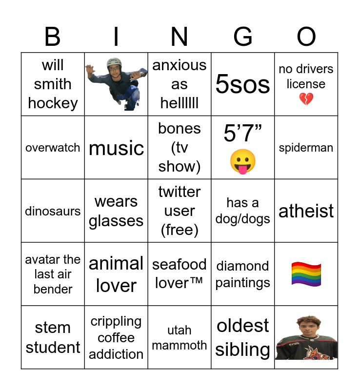 This bingo card has 2 images, a free space and 22 words: animal lover, crippling coffee addiction, bones (tv show), stem student, no drivers license π, will smith hockey, overwatch, has a dog/dogs, seafood loverβ’οΈ, 5β7β π, dinosaurs, diamond paintings, π³οΈβπ, music, oldest sibling, atheist, anxious as hellllll, spiderman, wears glasses, avatar the last air bender, 5sos and utah mammoth.