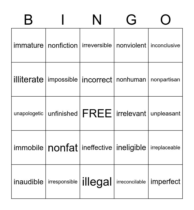 This bingo card has a free space and 24 words: nonfat, irresponsible, incorrect, inaudible, inconclusive, immature, illiterate, nonfiction, irrelevant, ineffective, nonhuman, unapologetic, ineligible, irreplaceable, impossible, irreconcilable, unpleasant, irreversible, nonpartisan, unfinished, imperfect, immobile, nonviolent and illegal.