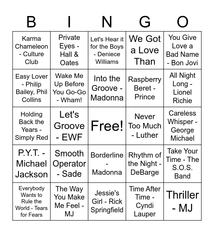 This bingo card has a free space and 73 words: I Wanna Dance with Somebody - Whitney, Jump - Van Halen, Karma Chameleon - Culture Club, Sweet Dreams - Eurythmics, Take on Me - a-ha, Livin on a Prayer - Bon Jovi, P.Y.T. - Michael Jackson, How Will I Know - Whitney, Rhythm of the Night - DeBarge, Don't Stop Believin' - Journey, Wanna Be Startin' Somethin' - MJ, Girls Just Want to Have Fun - Cyndi Lauper, Wake Me Up Before You Go-Go - Wham!, Careless Whisper - George Michael, Everything She Wants - Wham!, Private Eyes - Hall & Oates, Jessie's Girl - Rick Springfield, Easy Lover - Philip Bailey, Phil Collins, Walk This Way - Run-DMC/ Aerosmith, Never Too Much - Luther, Into the Groove - Madonna, We Got a Love Than, You Give Love a Bad Name - Bon Jovi, Don't You (Forget About Me) - Simple Minds, Everybody Wants to Rule the World - Tears for Fears, Footloose - Kenny Loggins, La Bamba - Los Lobos, Never Gonna Give You Up - Rick Astley, Upside Down - Diana Ross, What's Love Got to Do with It - Tina Turner, The Way You Make Me Feel - MJ, Saving All My Love - Whitney, I Can't Go for That - Hall & Oates, Lady - Commodores, Let's Groove - EWF, When Doves Cry - Prince, How Will I know - Whitney Houston, Beat It - Michael Jackson, Thriller - MJ, Back in Black - AC/DC, Time After Time - Cyndi Lauper, Smooth Operator - Sade, Dancing in the Dark - Bruce Springsteen, Take Me Home Tonight - Eddie Money, True - Spandau Ballet, Raspberry Beret - Prince, Let's Hear it for the Boys - Deniece Williams, I'm So Excited - The Pointer Sisters, Ain't Nobody - Chaka Khan, Holding Back the Years - Simply Red, Carribean Queen - Billy Ocean, Word Up - Cameo, Tell it to My Heart - Taylor Dayne, In the Air Tonight - Phil Collins, Do You Really Want To Hurt Me - Culture Club, Papa Don't Preach - Madonna, Somebody's Watching Me - Rockwell, Borderline - Madonna, Human Nature - MJ, Sussudio - Phil Collins, She's a Bad Mama Jama - Carl Carlton, Outstanding - The Gap Band, Do I Do - Stevie Wonder, All Night Long - Lionel Richie, Heaven Is A Place On Earth - Belinda Carlise, Sweet Love - Anita Baker, Cool It Now - New Edition, Mr. Telephone Man - New Edition, Take Your Time - The S.O.S. Band, I Like It - DeBarge, Give It To Me Baby - Rick James, Nasty - Janet Jackson and Control - Janet Jackson.
