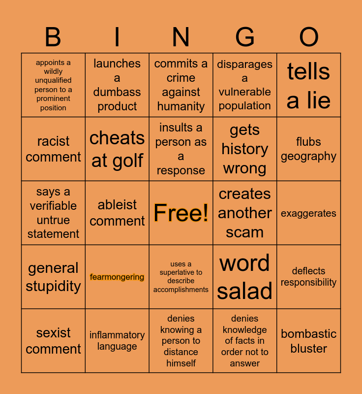 This bingo card has a free space and 24 words: fearmongering, inflammatory language, insults a person as a response, sexist comment, tells a lie, appoints a wildly unqualified person to a prominent position, racist comment, launches a dumbass product, creates another scam, uses a superlative to describe accomplishments, gets history wrong, says a verifiable untrue statement, word salad, deflects responsibility, cheats at golf, denies knowledge of facts in order not to answer, exaggerates, commits a crime against humanity, flubs geography, ableist comment, bombastic bluster, general stupidity, disparages a vulnerable population and denies knowing a person to distance himself.