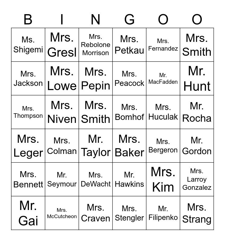 This bingo card has 36 words: Mr. Hawkins, Mrs. DeWacht, Mrs. Stengler, Mrs. Jackson, Mrs. Leger, Mrs. Bomhof, Mrs. Lowe, Mrs. Craven, Mrs. Fernandez, Mrs. Kim, Mr. Hunt, Mrs. Petkau, Mrs. Larroy Gonzalez, Mrs. Niven, Mrs. Peacock, Ms. Shigemi, Mrs. Bennett, Mrs. Huculak, Mrs. Thompson, Mrs. Rebolone Morrison, Mrs. Smith, Mrs. Colman, Mrs. Baker, Mr. Taylor, Mrs. Bergeron, Mrs. Gresl, Mr. MacFadden, Mrs. McCutcheon, Mrs. Pepin, Mrs. Smith, Mrs. Strang, Mr. Gai, Mr. Gordon, Mr. Rocha, Mr. Seymour and Mr. Filipenko.