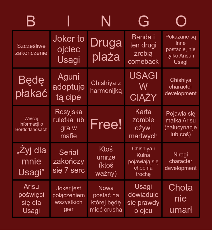 This bingo card has a free space and 24 words: Serial zakończy się 7 serc, Joker jest połączeniem wszystkich gier, Chishiya z harmonijką, Arisu poświęci się dla Usagi, Pokazane są inne postacie, nie tylko Arisu i Usagi, Szczęśliwe zakończenie, Będę płakać, Joker to ojciec Usagi, Karta zombie ożywi martwych, Ktoś umrze (ktoś ważny), USAGI W CIĄŻY, Więcej informacji o Borderlandsach, Chishiya i Kuina pojawiają się choć na trochę, Niragi character development, Aguni adoptuje tą cipe, Usagi dowiaduje się prawdy o ojcu, Pojawia się matka Arisu (halucynacje lub coś), Druga plaża, Chishiya character development, Rosyjska ruletka lub gra w mafie, Chota nie umarł, „Żyj dla mnie Usagi”, Banda i ten drugi zrobią comeback and Nowa postać na której będę mieć crusha.