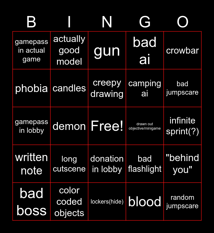 This bingo card has a free space and 32 words: blood, school or hospital, demon, crowbar, written note, candles, crowbar, "behind you", actually good model, breakable planks, creepy drawing, gun, asian theme, vent, drawn out objective/minigame, dead body, bad boss, gamepass in lobby, donation in lobby, long cutscene, bad flashlight, mimic sprint bar, infinite sprint(?), color coded objects, random jumpscare, bad ai, camping ai, phobia, gamepass in actual game, lockers(hide), chase sequence and bad jumpscare.