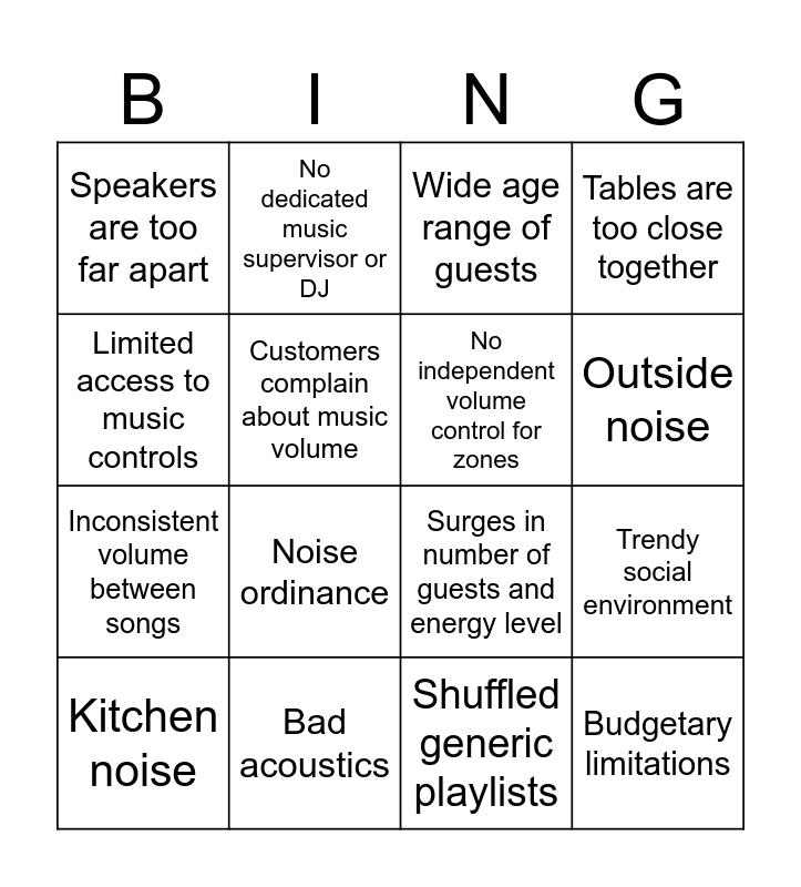 This bingo card has 16 words: Bad acoustics, Trendy social environment, Wide age range of guests, Speakers are too far apart, Inconsistent volume between songs, No dedicated music supervisor or DJ, Surges in number of guests and energy level, Shuffled generic playlists, Limited access to music controls, Customers complain about music volume, Kitchen noise, Tables are too close together, Noise ordinance, Outside noise, No independent volume control for zones and Budgetary limitations.