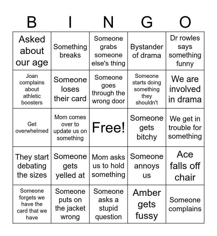This bingo card has a free space and 24 words: Someone gets yelled at, Someone puts on the jacket wrong, Someone goes through the wrong door, Someone forgets we have the card that we have, Dr rowles says something funny, Asked about our age, Joan complains about athletic boosters, Something breaks, Someone gets bitchy, Mom asks us to hold something, Someone starts doing something they shouldn't, Get overwhelmed, Someone annoys us, Ace falls off chair, Someone loses their card, Amber gets fussy, We get in trouble for something, Someone grabs someone else's thing, We are involved in drama, Mom comes over to update us on something, Someone complains, They start debating the sizes, Bystander of drama and Someone asks a stupid question.